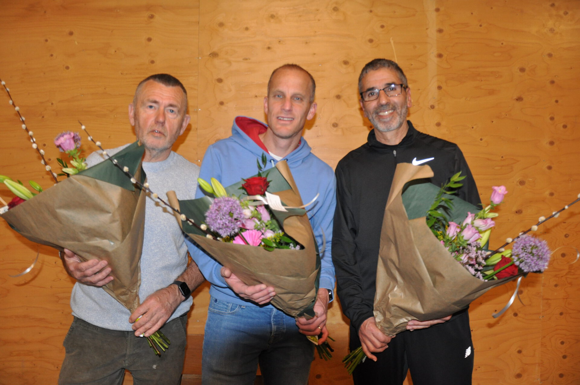 Na de huldiging van de Marathonlopers werden de drie geslaagde trainers door het Bestuur nog even in het zonnetje gezet.